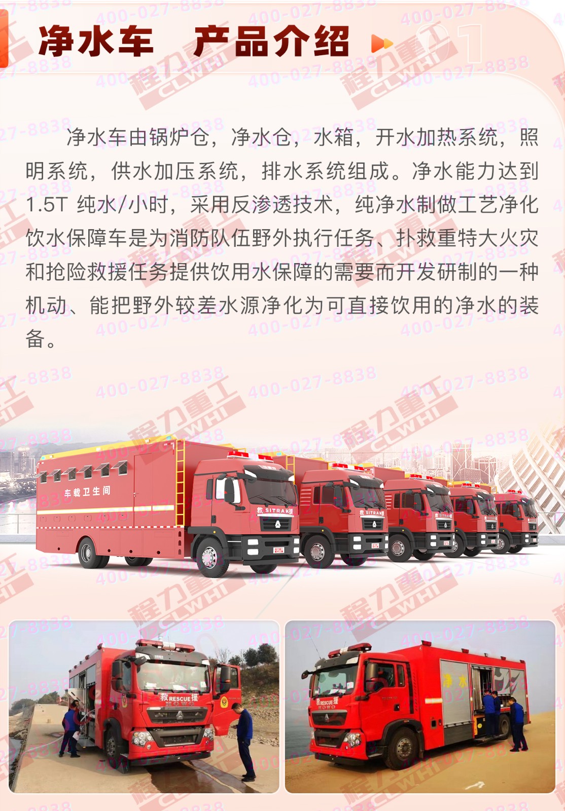 用于應(yīng)急消防,軍隊(duì)作戰(zhàn),部隊(duì)野外作業(yè)、部隊(duì)?wèi)?zhàn)地演習(xí)、戰(zhàn)地醫(yī)院;地震、洪災(zāi)、泥石流等自然災(zāi)害發(fā)生時野外原水凈化,清潔水?dāng)y帶,凈水及開水供應(yīng)功能。