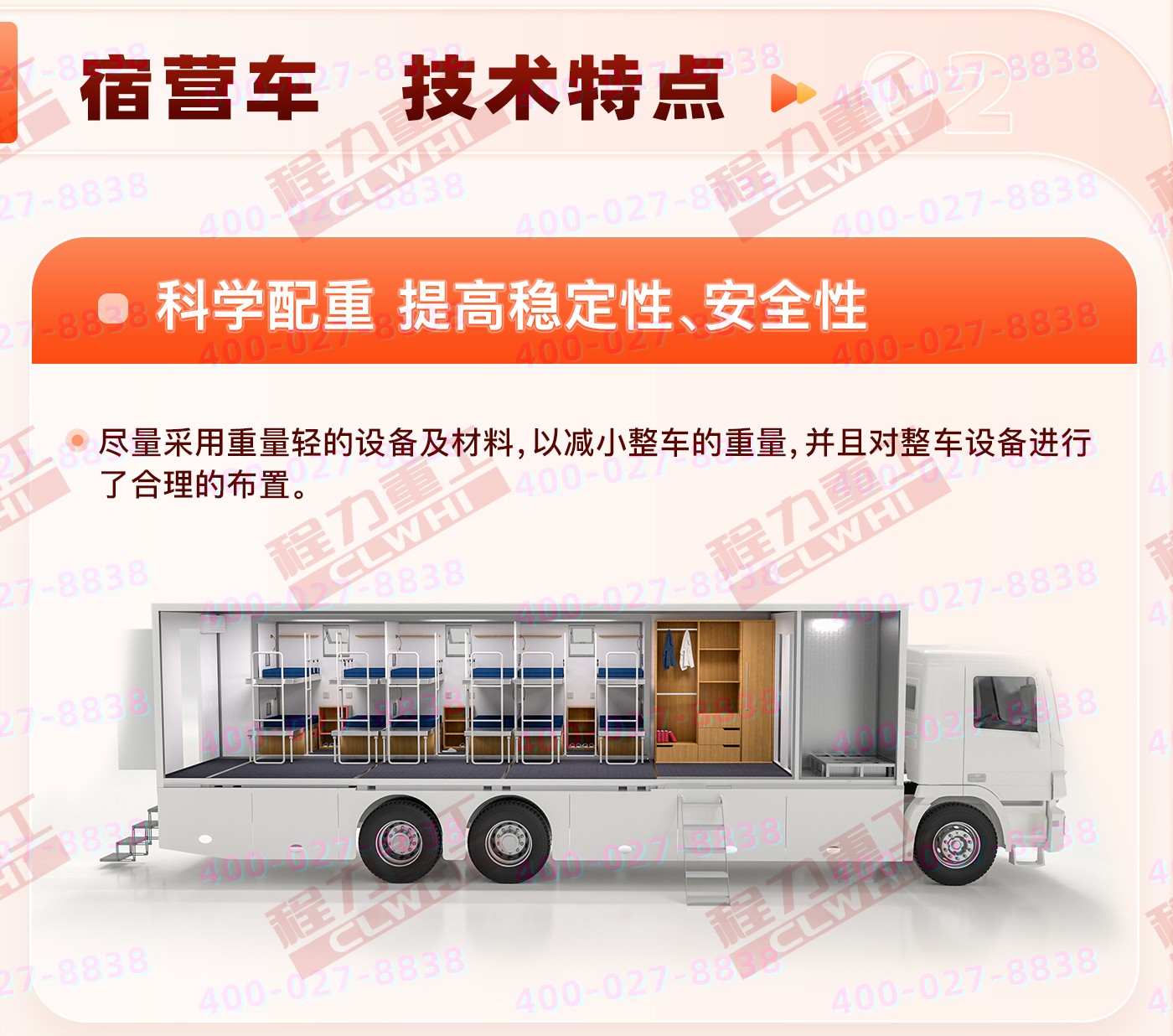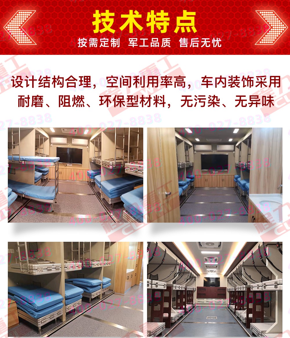 主要專用裝置發(fā)電機(jī),折疊床鋪等,選裝配置衛(wèi)浴間、凈水箱、外掛式空調(diào)、衛(wèi)星天線、吸頂電視、換氣扇、車廂左、右可選裝擴(kuò)展機(jī)構(gòu)箱體、車廂左、右兩側(cè)、后部增加或封閉窗戶、車門、車輛顏色可選裝裝有具有衛(wèi)星定位的行車記錄儀等,不擴(kuò)展可供8-12住宿,擴(kuò)展后可供20-24人住宿。(可根據(jù)客戶要求改裝)