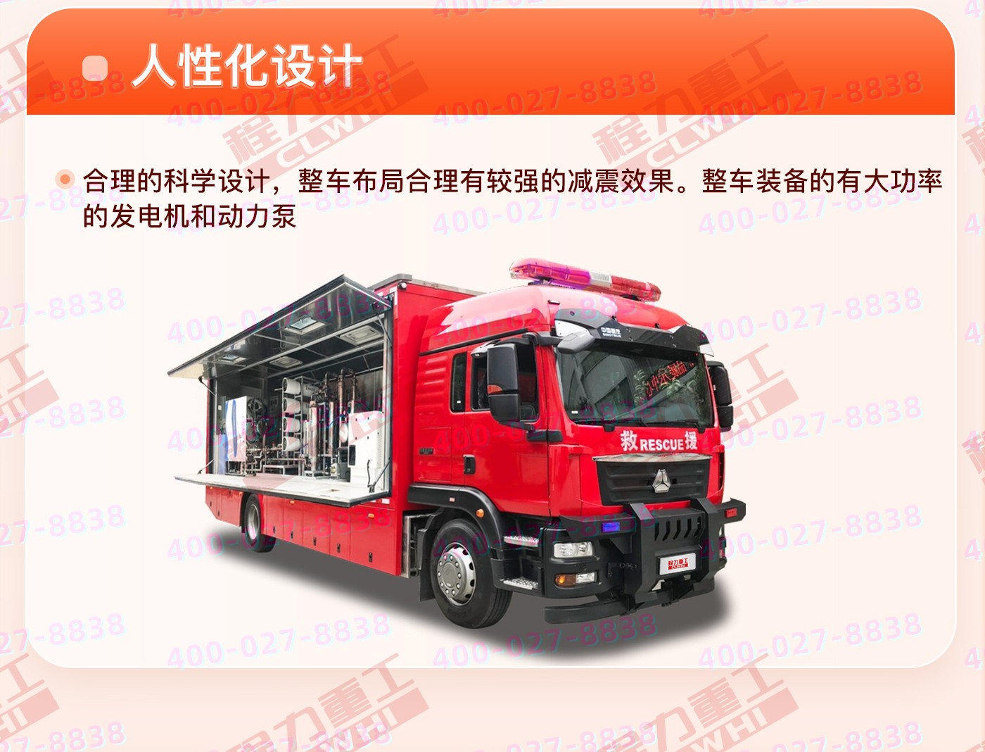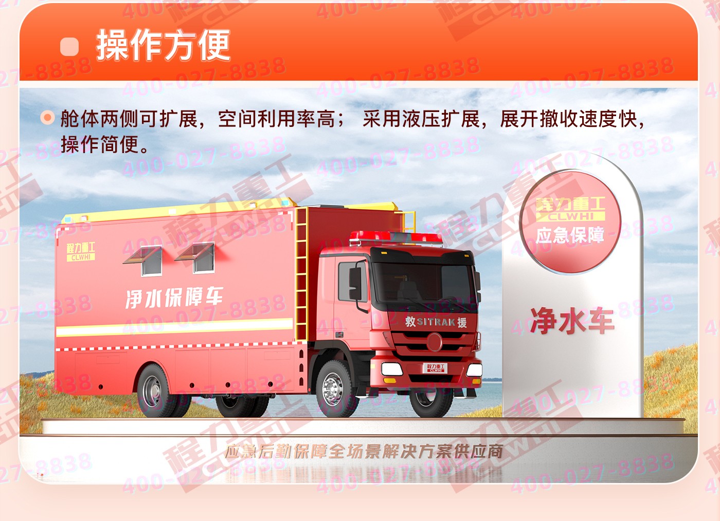 用于應(yīng)急消防,軍隊(duì)作戰(zhàn),部隊(duì)野外作業(yè)、部隊(duì)?wèi)?zhàn)地演習(xí)、戰(zhàn)地醫(yī)院;地震、洪災(zāi)、泥石流等自然災(zāi)害發(fā)生時野外原水凈化,清潔水?dāng)y帶,凈水及開水供應(yīng)功能。