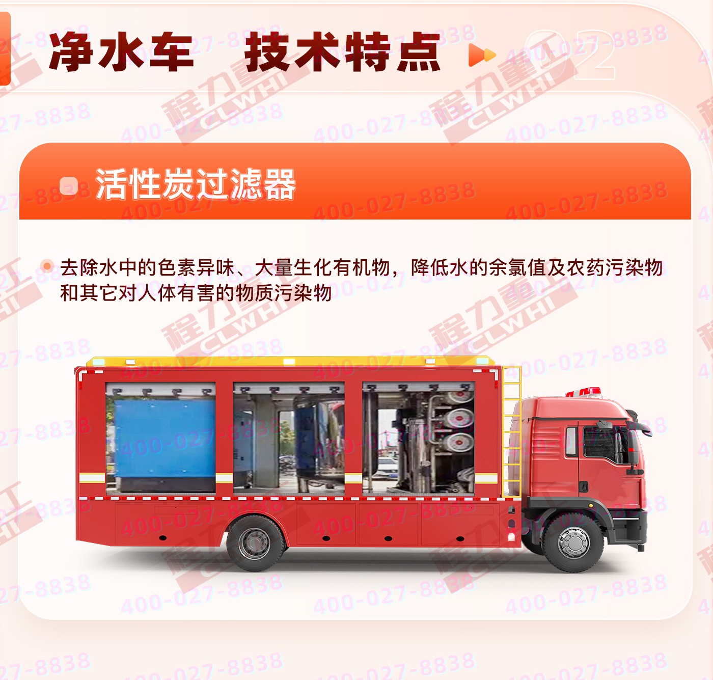 重汽豪沃凈水車由我公司在基型車重汽污水處理車基礎(chǔ)上進(jìn)行排放升級而成, 此凈水車由重汽4*2二類底盤,凈水車專用大廂,鍋爐倉,凈水倉,水箱,開水加熱系統(tǒng),照明系統(tǒng),供水加壓系統(tǒng),排水系統(tǒng)組成。凈水能力達(dá)到1.5T純水/小時,采用反滲透技術(shù),純凈水制做工藝.凈化飲水保障車是為消防隊(duì)伍野外執(zhí)行任務(wù)、撲救重特大火災(zāi)和搶險救援任務(wù)提供飲用水保障的需要而開發(fā)研制的一種機(jī)動、能把野外較差水源凈化為可直接飲用的凈水的裝備。