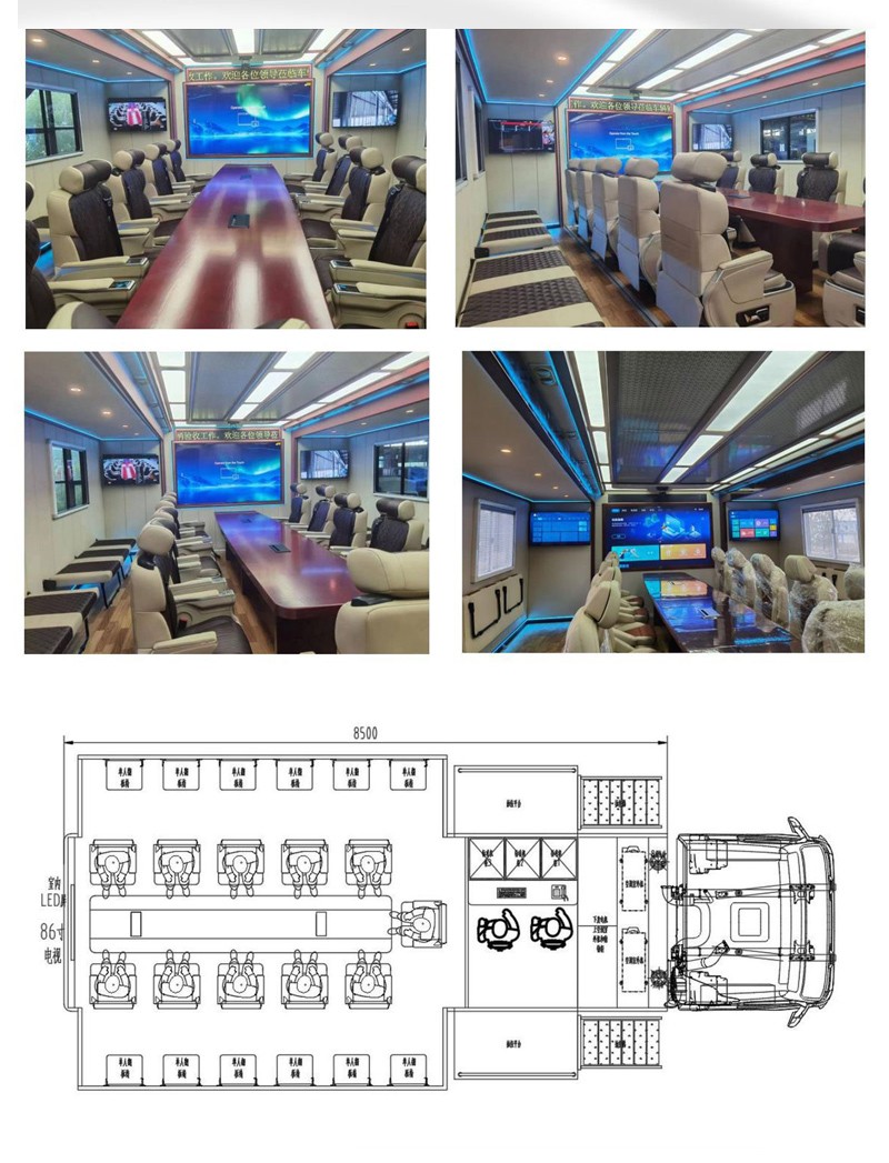 重汽后雙橋大型指揮車:重汽汕德卡6*4底盤,軸距:5000+1400mm 總質(zhì)量:21000Kg,整車尺寸:11270*2550*3990mm,車內(nèi)配備9人會議桌椅,另配4個壁掛式折疊座椅,廂體前部為會議區(qū)中間部為設(shè)備操作區(qū),廂體尾部為休息區(qū)(底部安裝發(fā)電機(jī)組).